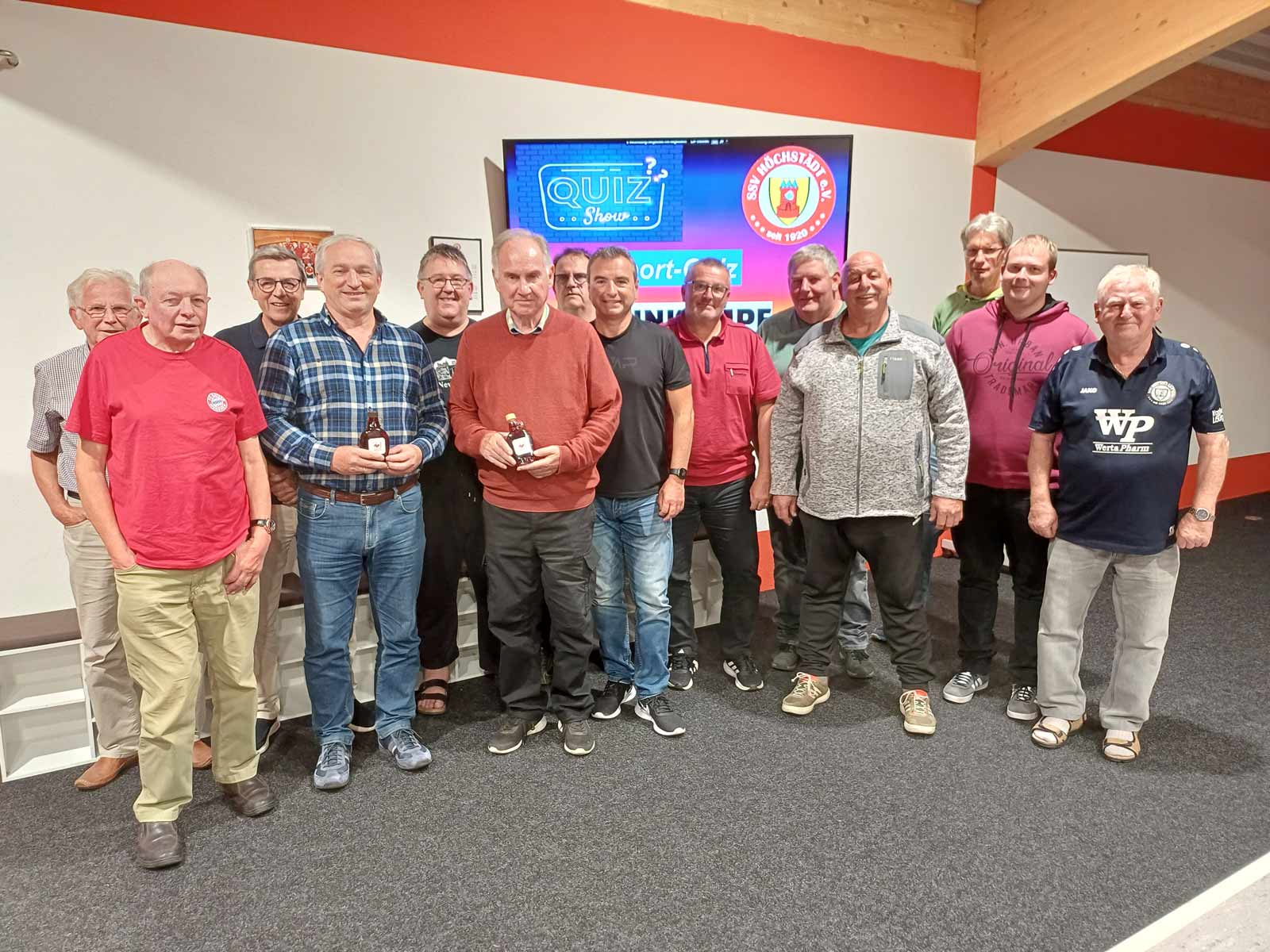 Von links: Eugen Konrad, Alfons Blau, Manfred Hartmann, Peter Schneller, Stefan Gmähle, Helmut Wagner, Joachim Hauf, Frank Wagner, Günther Schmidt, Bruno Bäuerle, Albert Huber, Herbert Trumm, Markus Huber, Georg Karg und Quiz-Master Gerald Maneth.