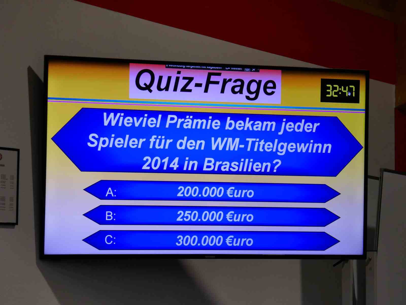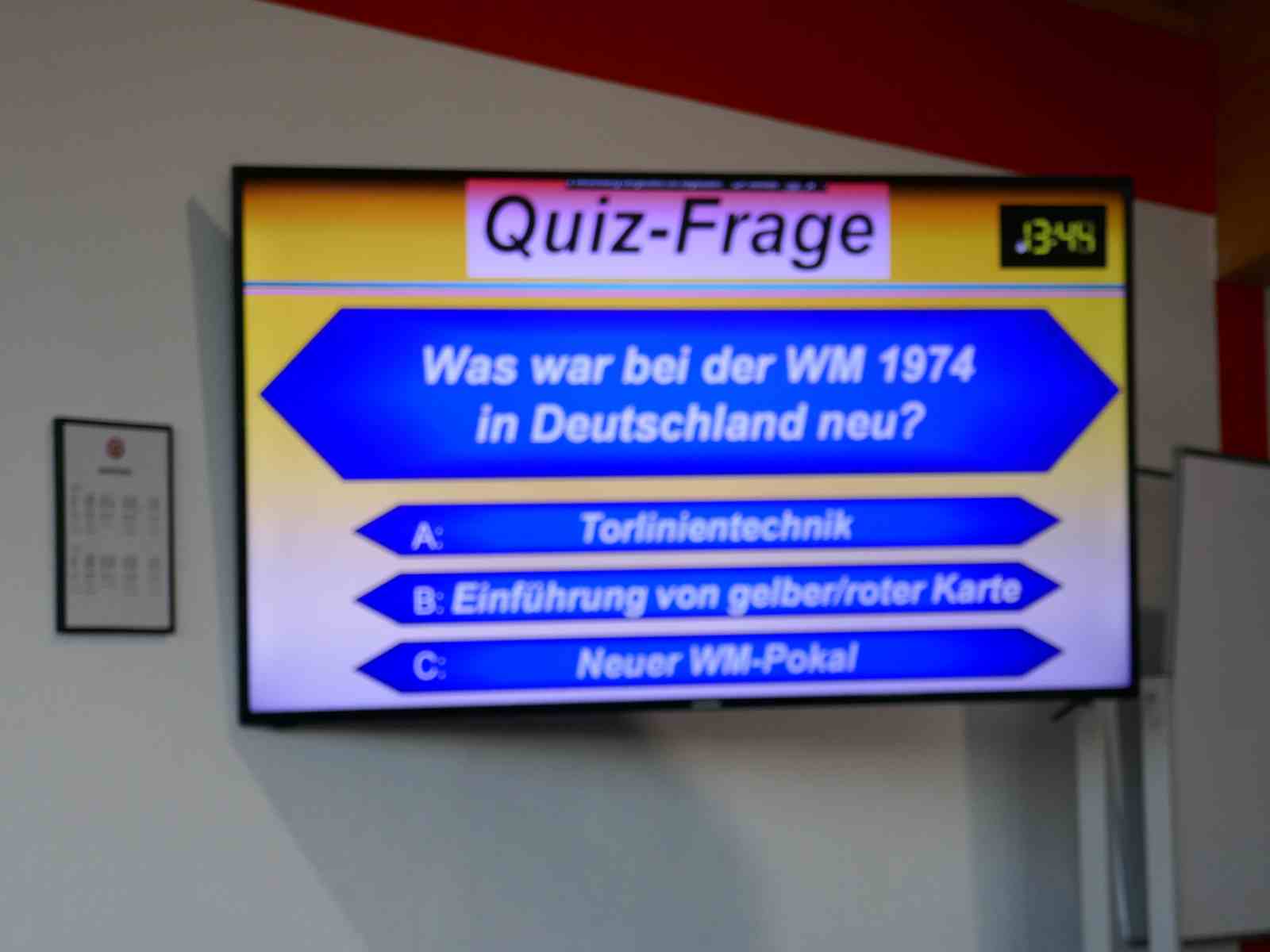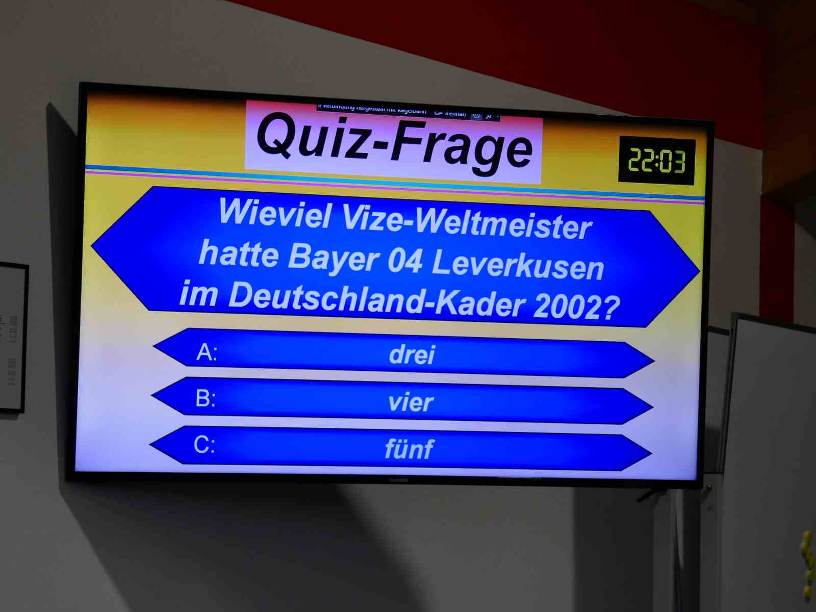 Am 03. April 2025 veranstaltete Gerald Maneth den diesjährigen zweiten Sport-Quiz-Show-Abend. Als Thema mussten „30 Fragen zum Fußball“ (Fußball-Weltmeisterschaften, Champions-League und Bundesliga) von allen Teilnehmern ausnahmsweise schriftlich beantwortet werden. Die 12 Kandidaten waren in drei Zehnerblöcken gefordert. Danach wurden jeweils die Lösungen besonders unterhaltsam präsentiert, denn sowohl Fußball-Videos, damalige WM-Songs und lustige Fußball-Sketche wurden eingespielt. Nach den ersten Zehnerblock-Fragen lagen Helmut Wagner und Peter Schneller in Führung, die alle zehn Antworten richtig hatten. Nach den zweiten Zehnerblock-Fragen lag Helmut Wagner mit 18 richtigen Antworten gegenüber Peter Schneller mit 17 richtigen Antworten in Führung. Nach den dritten Zehnerblock-Fragen konnte Frank Wagner (Sohn von Helmut) mit insgesamt 24 richtigen Antworten noch vorbeiziehen und den Quiz-Wettbewerb gewinnen. Mit 23 richtigen Antworten teilten sich Helmut Wagner und Günther Schmidt den zweiten Platz.