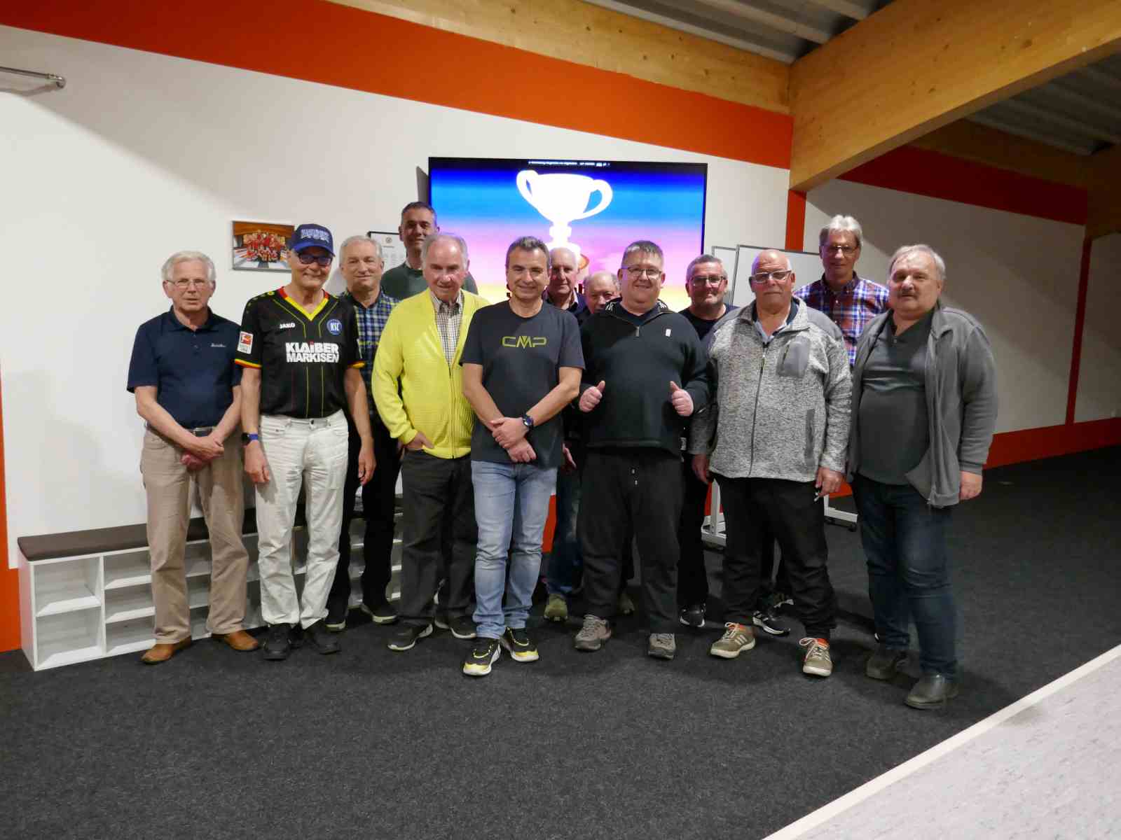 Von links: Eugen Konrad, Jürgen Titze, Peter Schneller, Jürgen Hartshauser, Helmut Wagner, Frank Wagner, Erich Wengenmayr, Alfons Blau, Stefan Gmähle, Günther Schmidt, Albert Huber, Herbert Trumm und Quiz-Master Gerald Maneth.